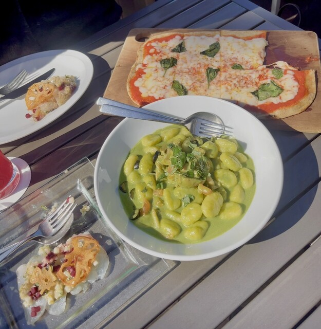 手前:鶏肉とバジルのニョッキ/右奥:モッツァレラ トマトソース バジルのマルゲリータフラットブレッドピザ