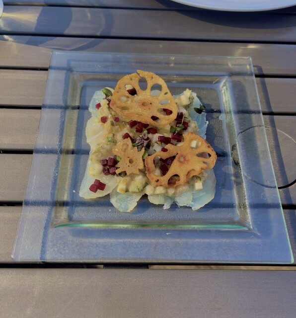 真鯛のカルパッチョ 柚子のラヴィゴットソースと蓮根チップ