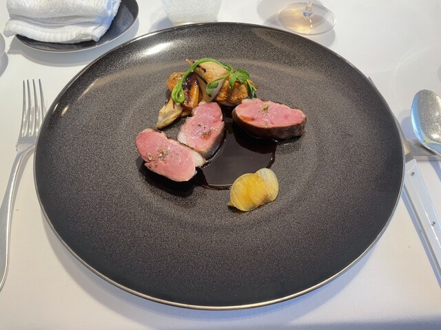 鴨胸肉のドレ 白アワビ茸と柿 ポルト酒のソース
