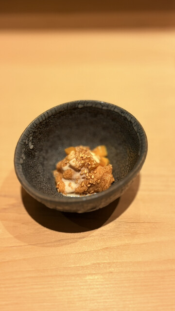 コースは名物の本鮪中トロの握りから始まり、最初の一口でシャリのキレと脂の甘みが溶け合う感覚に驚かされます。続くたまねぎのスリ流しは素材の甘みが凝縮されており、九絵のしゃぶしゃぶはちり酢の爽やかさが身の旨味を際立たせていました。蛤の茶碗蒸しはあおさの香りが豊かで、あん肝とマンゴーの白和えという意外な組み合わせも、胡麻の風味が全体を見事にまとめています。焼き立てのカラスミ餅や、桜海老の餡が香ばしい白子といった温かい料理の数々も、温度帯が完璧で一切の妥協がありません。後半の握りでは、塩と酢橘でいただくスミイカの食感や、濃厚な甘みの縞海老、そして塩釜産の赤身漬けから大トロへと続く鮪の連作が圧巻でした。特に蛇腹の大トロは、口の中でほどけるような柔らかさと力強い旨味が共存しており、思わず目を閉じてしまうほどの美味しさです。最後を締めくくる小肌の締め具合も絶妙で、大将の技術の高さが光っていました。美味しい料理だけでなく、スタッフ全員で作り上げる至福のひとときを過ごせるこの場所には、これからも通い続けたいと強く感じます。