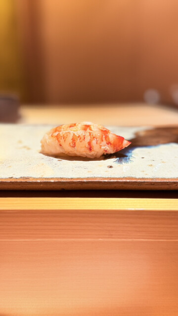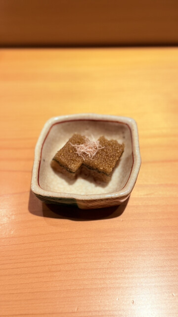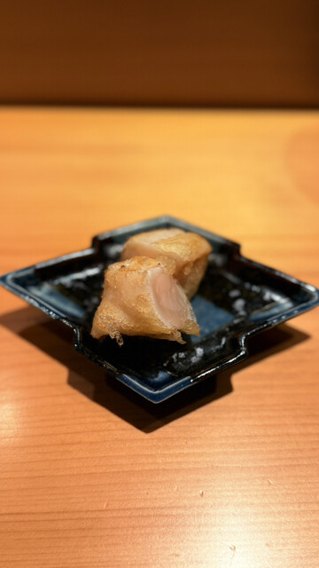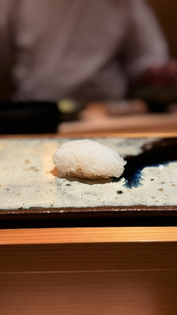 10回目以上の訪問となりますが、今回も扉を開けた瞬間に広がる凛とした空気感と大将の温かい笑顔に包まれ、最高の時間を過ごすことができました。まずはクエのお椀から始まりましたが、軽く熟成させたクエの身は驚くほど旨味が凝縮されており、出汁の優しさが五臓六腑に染み渡ります。続いて提供された子持ち昆布の心地よい食感、そして絶妙な火入れで中をレアに仕上げた帆立の揚げ物が食欲を加速させます。青ナマコはもみじおろしでさっぱりといただき、脂の乗った鯖は胡麻醤油と大葉の香りが完璧に調和していました。希少なあこやがいの貝柱の食感を楽しみ、本鮪の照り焼きは筋トロの部分でありながら筋感を一切感じさせない柔らかさで、からしのアクセントが脂の甘みを引き立てます。握りに移ると、昆布締めで旨味を乗せた白甘鯛、漬けにすることで香りが際立つ鰆と続き、待望の本鮪へと繋がります。青森県三厩産の中トロは口の中でとろけるような脂の質が素晴らしく、赤身の酸味とシャリの酸味が完璧に融合していました。天草産の小肌は絶妙な締め加減で、中トロの背中部分、そして大間産の炙った大トロへと続く鮪の連作は圧巻の一言です。アオリイカのねっとりとした甘みを塩と酢橘で堪能した後は、フグの白子を贅沢に使った小丼が登場しました。黄身醤油と山椒の香りが濃厚な白子に絡まり、これ以上ない幸福感に満たされます。技術、素材、そして大将の心意気まで、すべてが調和した素晴らしい宴でした。
