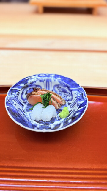 赤坂おぎ乃を初めて訪れましたが、扉を開けた瞬間の清々しい空気と、スタッフの方々の温かい出迎えに一瞬で心が解けました。2月の訪問ということもあり、節分をテーマにした趣向を凝らした構成に、最初から最後まで期待が膨らみます。まずは梅のジュースで口を清めると、菊芋の擦り流しを合わせた茶碗蒸しが登場しました。土の力強い香りと梅干しの酸味が重なり、胃が優しく温まります。続く細魚と車海老の皿は、お酢のジュレが素材の甘みを鮮やかに引き立てていました。白甘鯛の炭火焼きは、皮目は驚くほど香ばしく、身はしっとりと解ける絶妙な火入れです。藁焼きにされた鰆や、胡麻の風味が新しいアオリイカのお造りも、一品ごとに驚きがありました。フグ白子のおかゆは河豚の出汁で炊き上げたお米に、とろけるような白子とカラスミの塩気が加わり、これ以上ないほどの幸福感に包まれます。揚げ百合根豆腐の白味噌仕立ては、濃厚な甘みが冷えた体に染み渡りました。八寸は、愛知鴨の治部煮や鰯のフライなど、彩り豊かな季節の肴が並び、思わず日本酒を注文してしまいました。締めのご飯も、白バイ貝の福ご飯から始まり、炊き立ての白米を鰹節や鮪のブツでいただくという、日本人で良かったと心底思える構成です。デザートの出来立てのいちご大福まで完璧な流れでした。荻野氏の技と真心が細部まで宿った、まさに非の打ちどころがない至福のひとときでした。