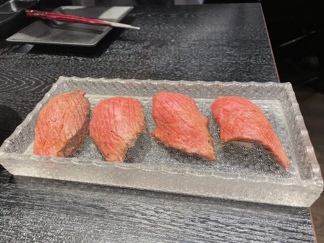 前菜の肉寿司は豪快な厚切りながら歯切れの良い柔らかな赤身