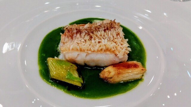 お昼のコースとシャンパンをいただきました。華やかで綺麗な見た目と、素材の美味しさが引き出されたお料理に、感動させられます。「鮎のパテアンクルート」は、鮎の身のふっくらふんわりとした絶妙な食感を残しつつ鮎を何層も重ねて、鮎の身の香りと美味しさがぎゅっと凝縮されていて、とっても美味しかったです。