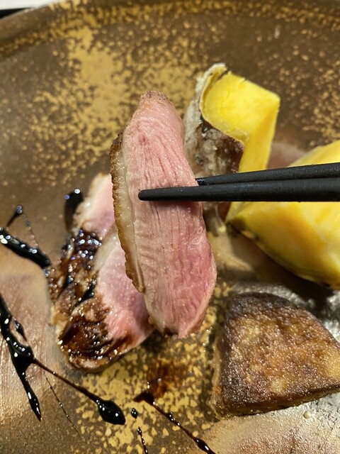 安納芋の天麩羅と鴨肉を使ったメインの一皿