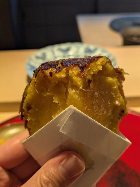 ・予約確認の際に、量の相談をさせていただいたのですが、皆様把握してくださっていました。全体量をできるだけ大きくしてくださったり、締めの大盛りなどのお心遣いをいただきました。そして、お土産のおにぎりにさつまいもの天ぷらまで付けてくださいました。