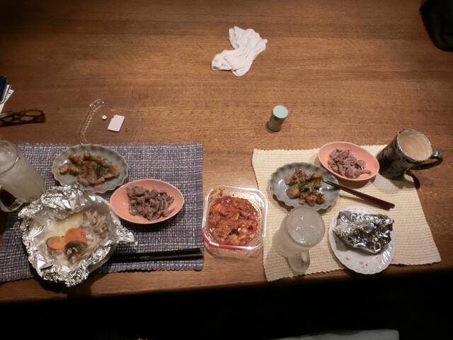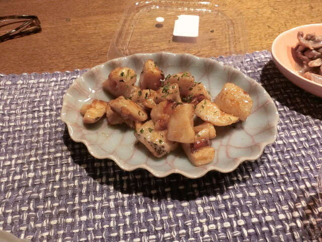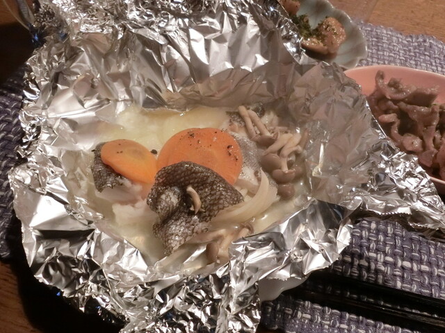夕食は白身魚のホイル焼きと砂肝焼きにレンコンの甘煮でした