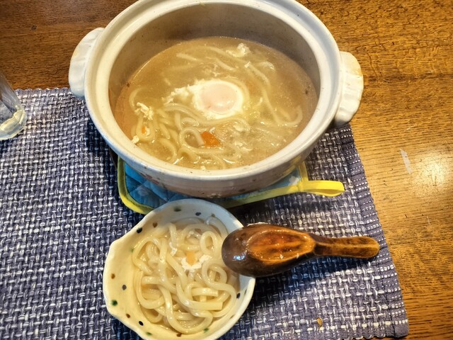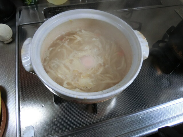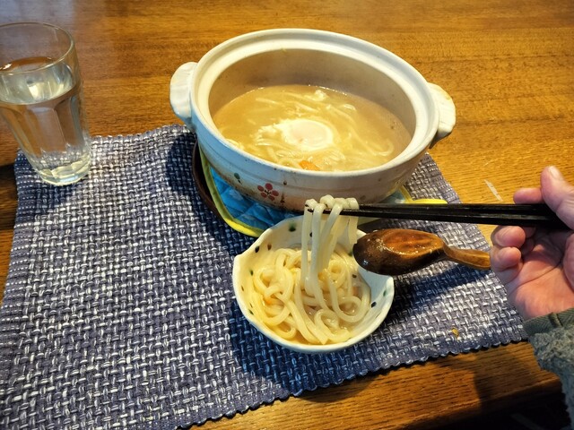 ランチは鍋汁が余っていたのでうどんと贅沢にも卵を落とし煮込んで食べた