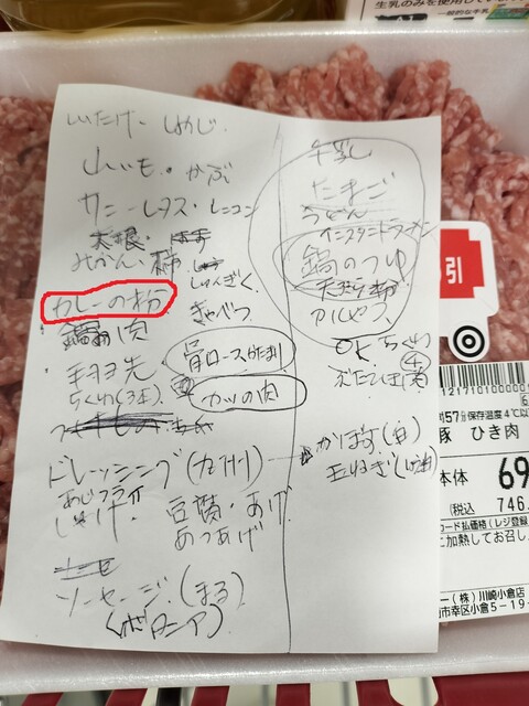 買い物メモにはカレーの肉と書いたはず言うのでメモを見直しても肉とは読めず粉としか読めません