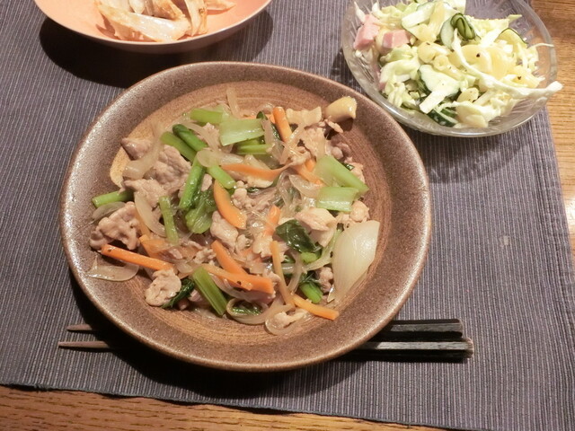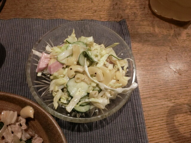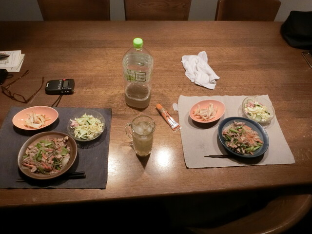 禁酒3日目の夕食はビーフン炒めと鳥のやげん焼とマカロニサラダでした