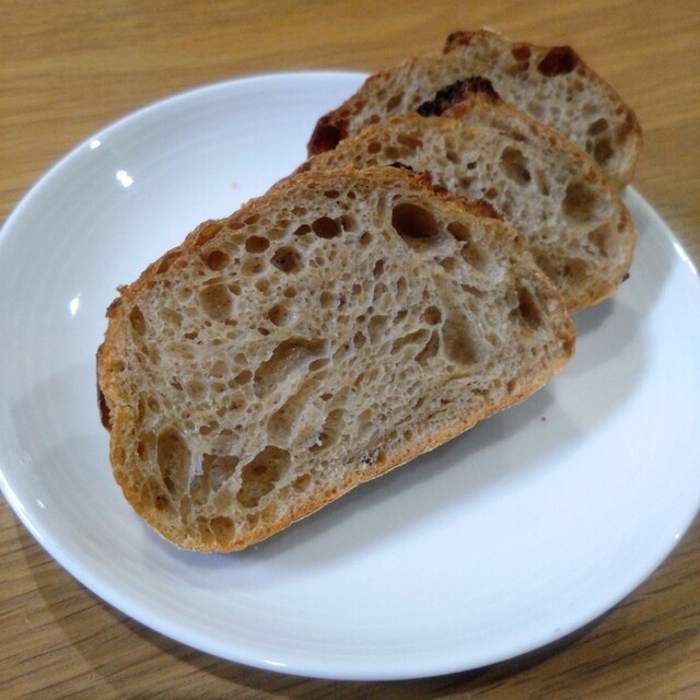 冷凍後リベイク。酸味は強すぎず、弱すぎず、チーズと一緒に食べたらとても相性よかった。外側バキバキ、中はしっとりむっちり。