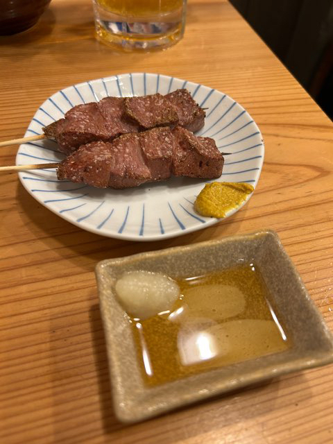 大好きなとり皮は二本、歯ごたえ心地よいねウメエ