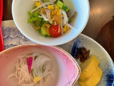 イカ刺しとサラダと、厚焼き玉子&シジミの佃煮