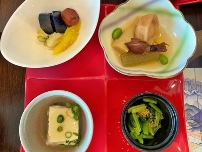 香物・炊き合わせ・自家製豆腐・小松菜の胡麻和え