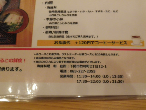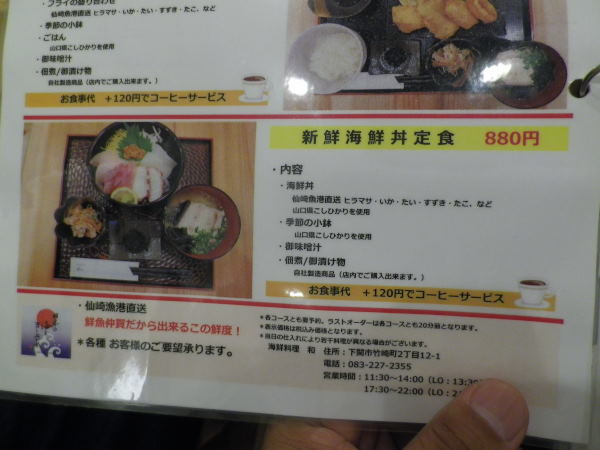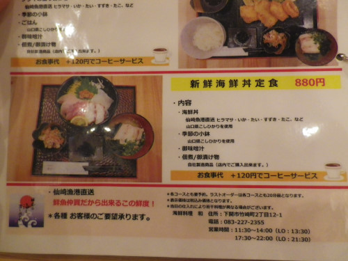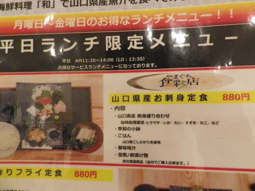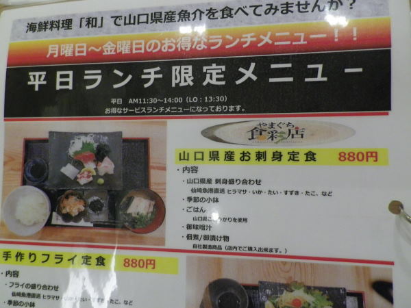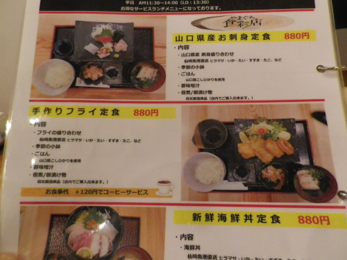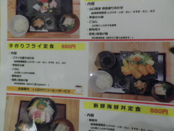 ランチメニューは、山口県産お刺身定食、手づくりフライ定食、新鮮海鮮丼定食 880円