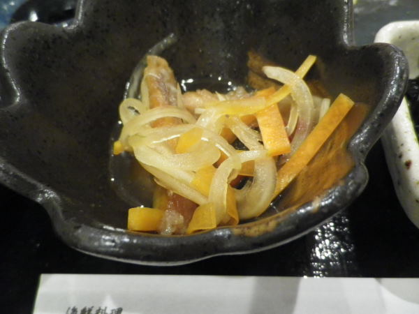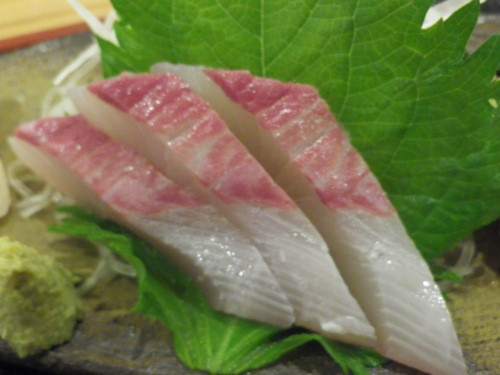 お皿にあまり食べたいことがない刺身がありました。金目鯛かな?美味しかった(^^)
