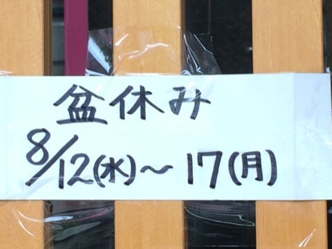 昨日、食事に行ったところ「盆休み 12~17日」と張り紙がありました(^_^;)