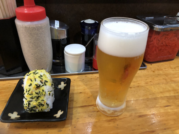 ほどなく、ビールとおにぎりが到着。