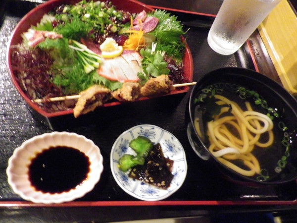 お刺身はサーモン、鯛、タコ、ミニうどんはあっさり系です。