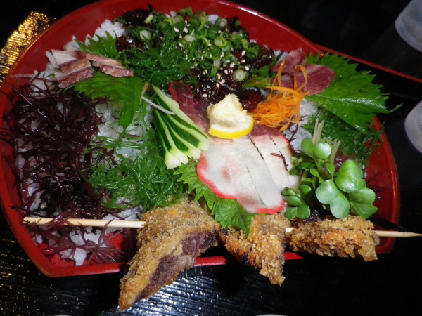 鯨のフライとくじらの刺身(くじらづけ、ベーコン、さえずり、ひゃくひろ)がのっています。