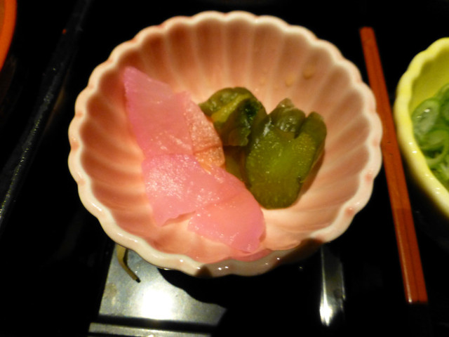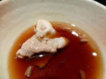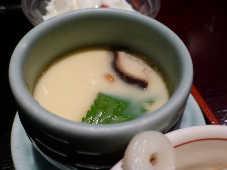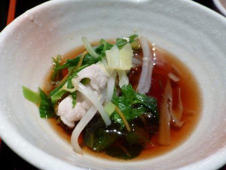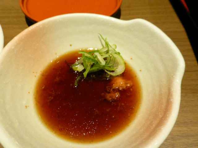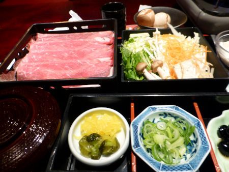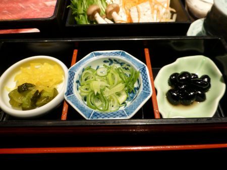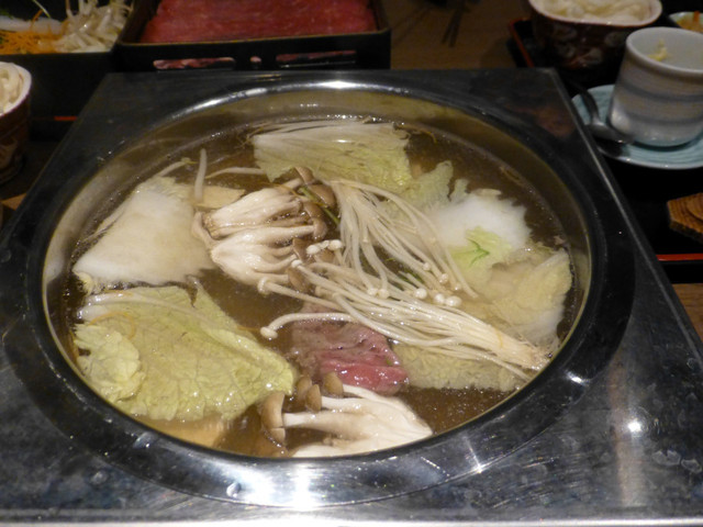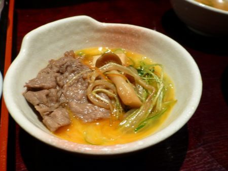 最初にお出汁が出て、次にお肉、お野菜、薬味、茶椀蒸しなどが出てきました。