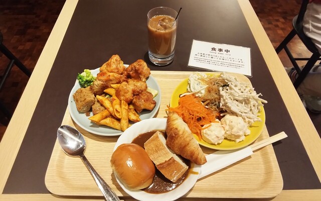 鶏、ハンバーグ、カレー、飯、野菜、アイスコーヒー、ポタージュスープ。