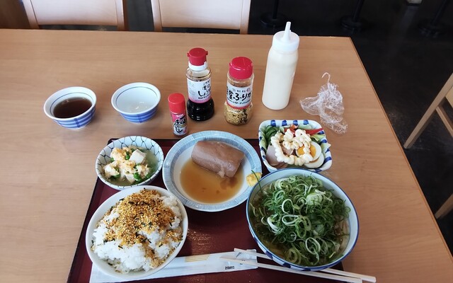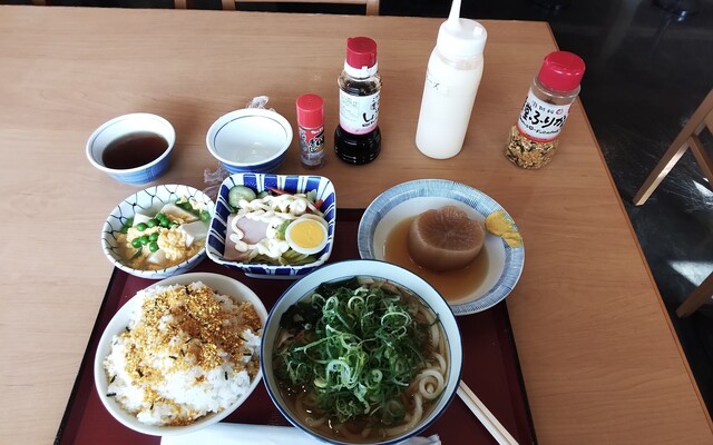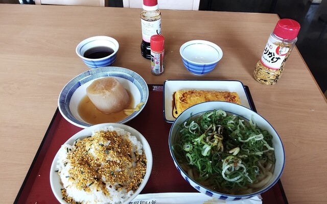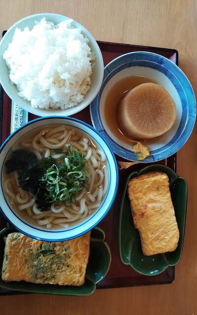 休みの日。ご飯大盛、かけうどん、大根、玉子焼。玉子焼半額です。