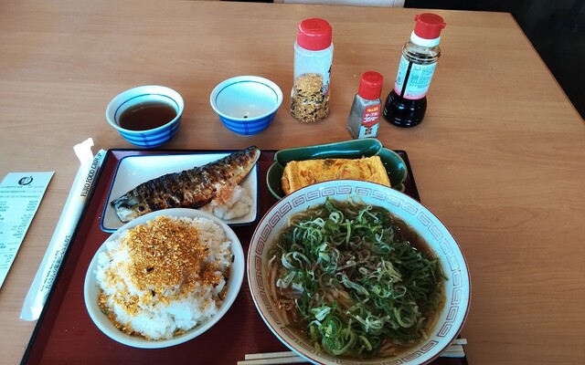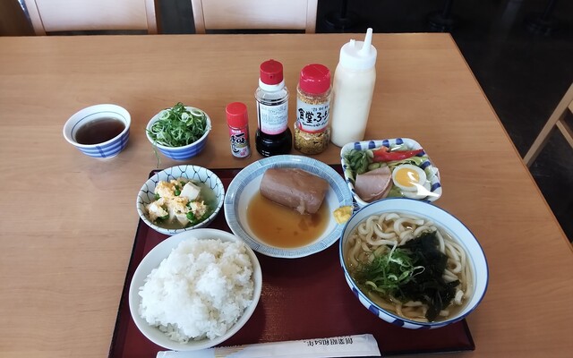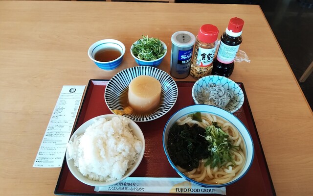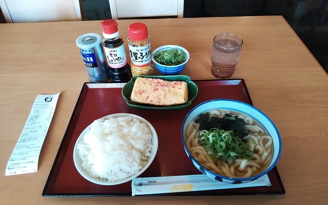 ご飯大盛り、かけうどん、今日は半額の玉子焼き、