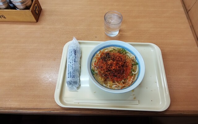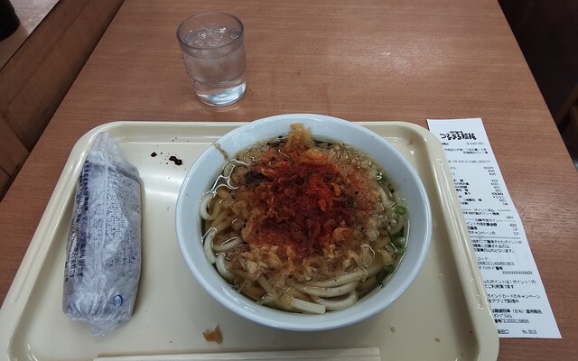 いつもの、かけうどん。天かす2杯、七味、一味、しょうゆ