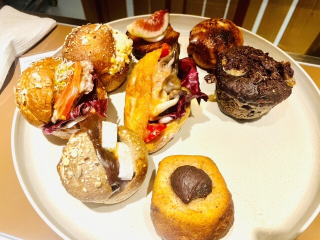 入るとすぐに惣菜系サンドイッチ、その後タルト、ブリオッシュ系、シンプルな甘いもの系、最後にドーナツという順番。フルーツサンドはレジのショーウィンドウにて注文。