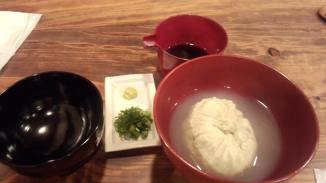 そば湯に浸かったそばがきを箸で切って取り分け、薬味(ねぎとわさび)を乗せてその上から出汁(そば出汁の濃い物)をかけていただきます。