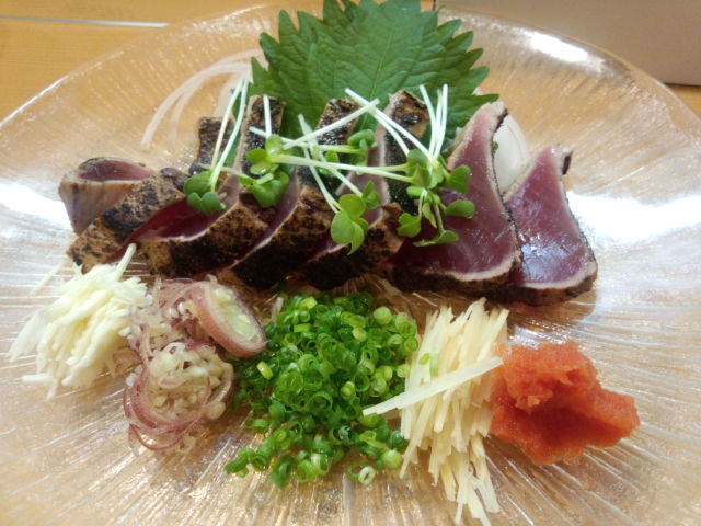 バーナーでしっかり表面を焼き中はほんのり火が通るぐらいの生です。新鮮で美味しいかつおです。