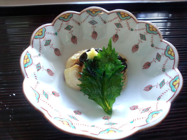 先付けは素麺を毬栗に見立てて素揚げした物に栗の殻は練り物で本物の大きい栗が中に入った物が有ります。