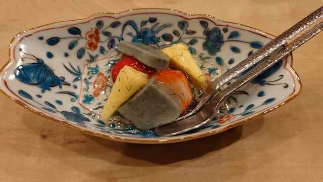 アコウの白身といかにはだいだい醤油も合いますが柚子胡椒入りで食べたのは初めてで面白い味だと思います。
