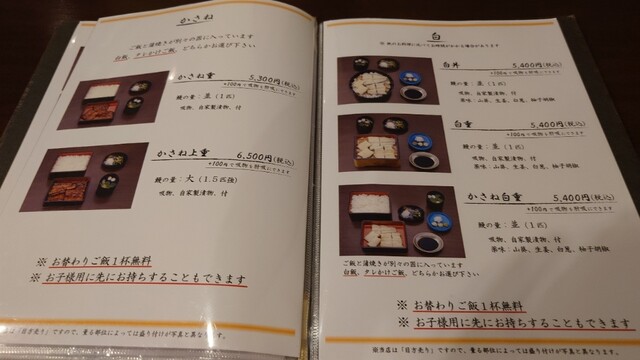 メニューはうな重(かさね)、うな丼各種の他に白焼きでは珍しい同じような重や丼があります。