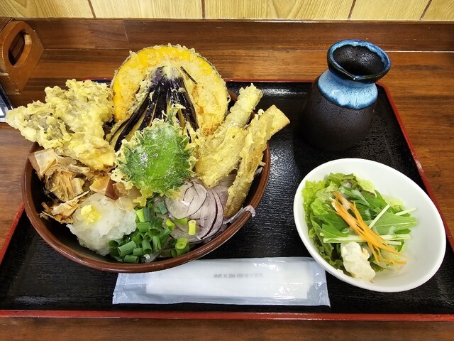 天ぷらはちくわ天半切れ、ごぼうのかき揚げ、ナス、...