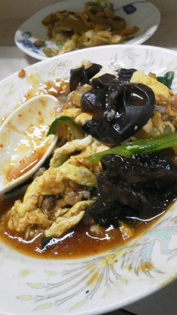 大きい「きくらげ」に、「タマゴ」「たまねぎ」「ニラ」などで炒めたビールのつまみにはもってこいの逸品!!