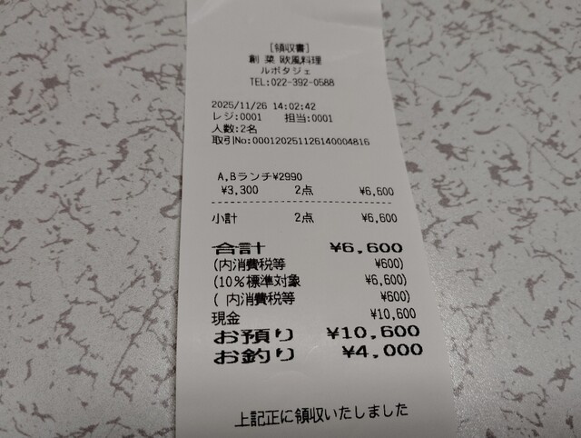 念願が叶い「ル ポタジェ」さんに伺う事が出来ました!事前に電話予約をしておきました!閑静な住宅街に佇むお店は周りの景観を損なう事無く外観から好感が持てました!さて店内に入り席に案内され、メニューを出されましたが、即答でAとBのランチコースをお願いしました!私がAコース(メインは肉料理)同行者はBコース(メインは魚料理)に決めてましたので…さて最初に運ばれてきたのは温かいアミューズ…料理の説明を丁寧にマダムにして頂きましたが、失念…但し2種類出ましたが、どちらも素晴らしく美味しい!野菜を美味しく食べれると聞いてましたが、アミューズから「ジャガイモや春菊や白菜」を使った料理で良いスタートです。スープは「カボチャのポタージュ」でしたが、スープの中にやはり細かくカットされた様々な野菜、豆が沢山入ってて食感か楽しい!「カボチャのポタージュ」って味が単調になりがちだけど、カットされた野菜にトマトが含まれててそれがまた良いアクセントになってて…一緒に食べたバゲットもやけに美味しいの(*^^*)さてメインが運ばれてきました…肉料理は「骨付き鶏もも肉のコンフェ」…なかなかナイフとフォークで食べるのが難しそう…因みに隣の席に座ってた先客の上品そうな御婦人は手掴みで…(@_@;)しかしここでも配膳してくれたマダムが綺麗にナイフとフォークで食べれる方法を丁寧にユーモアも交えてレクチャーしてくれたので、自分でも驚くほど綺麗に鶏肉を食べれました!しかし鶏肉の柔らかさや味も良かったですが、やはり周りを彩る野菜達の味が本当に良かった…因みに同行者の「魚料理」はサーモンでしたが、美味しかった様で大変喜んでました!デザートはシェフが自ら運ばれてやはり丁寧に説明して下さいました!実は此方のシェフとは知り合って間もなく40年位になるかも…仙台市内のホテルで共に働き、その後シェフはフランスに修行に行ったり…最後にシェフが作った料理を食べたのは、かつて泉区高森にあった「西洋レストラン泉亭」さんで食べたのが最後…最後に会話を交わしたのはシェフが遠刈田温泉の「蔵王メッツ」にいた時で…今回は約35年振り位にシェフの料理を頂き、会話を交わす事が出来ました!短い時間でしたが、様々な思い出話が尽きる事なく(笑)お互い歳を取ったなぁって(見た目ね)(笑)また死ぬ前に食べに行きますね(笑)素晴らしいひと時でした!有難う御座いました。