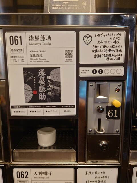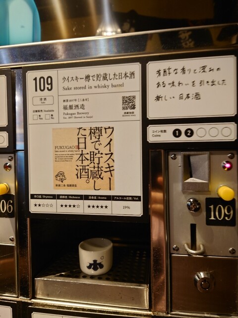 500円で専用コイン6枚もらい(通常は5枚、キャンペーン中)このコインを好きな銘柄に投入して、専用の小さなお猪口で飲むことができます。