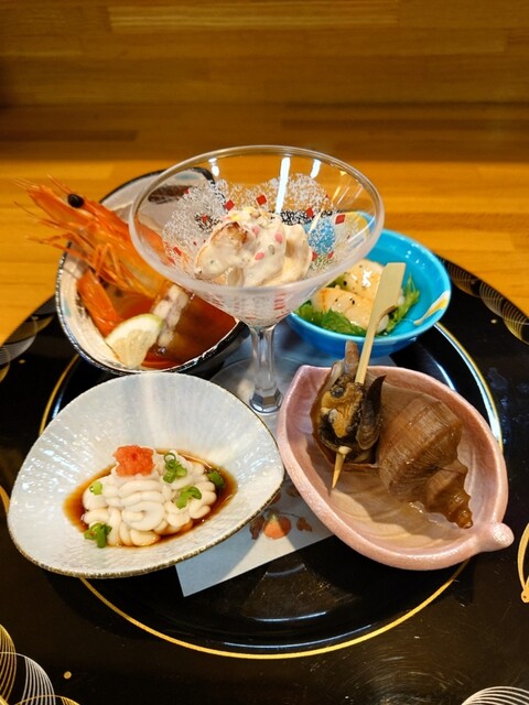 お通し 立派!タチやエビが並んでいます。これだけでも楽しめそう。