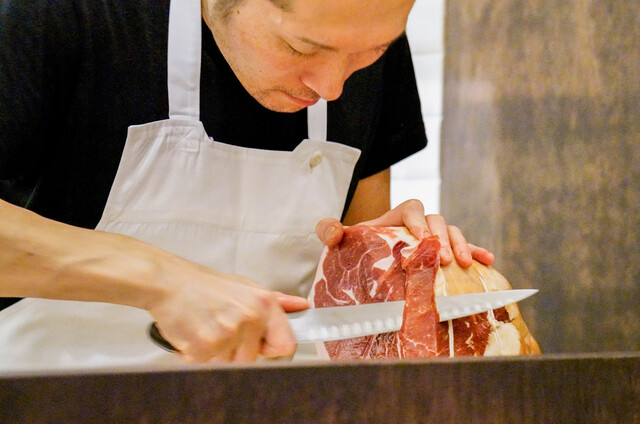 その生ハムをシルクのようにヒラッと翻すような薄さで切りつけます。