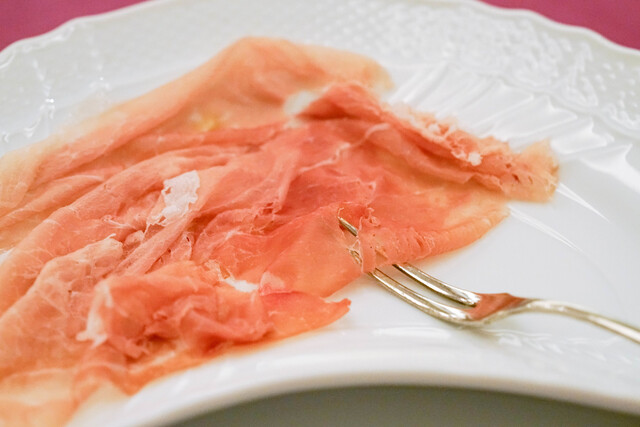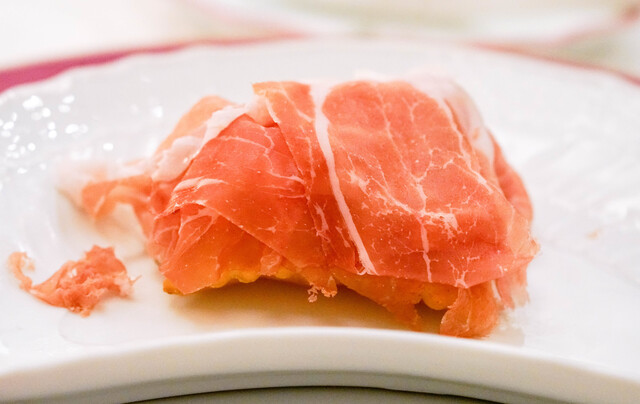 とても薄造りの綺麗な生ハム。舌触りが素晴らしく、世界一多田さんの生ハムを美味しく食べれる場所です。