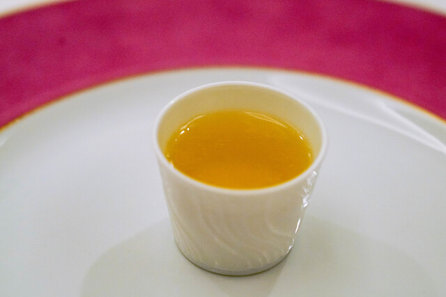 トンと置かれたスープ。黄金色に染まった凝縮した色味。