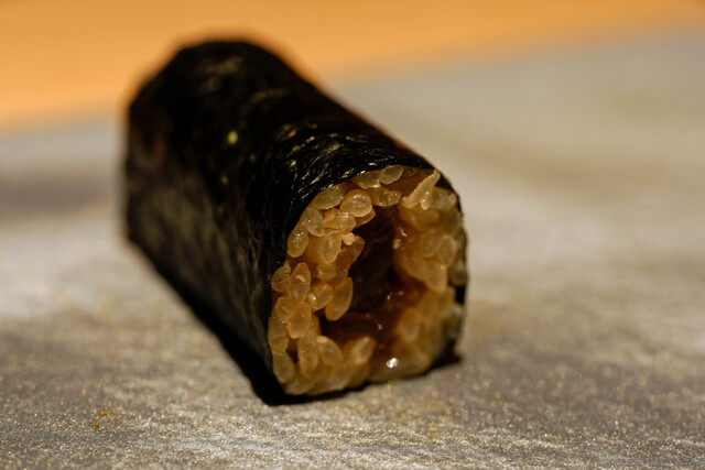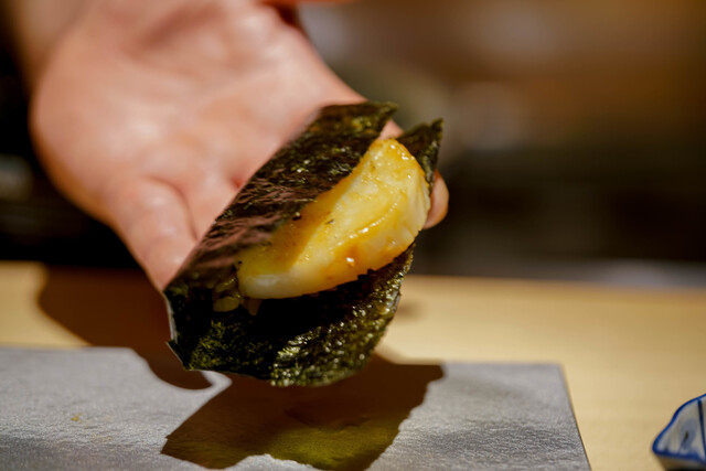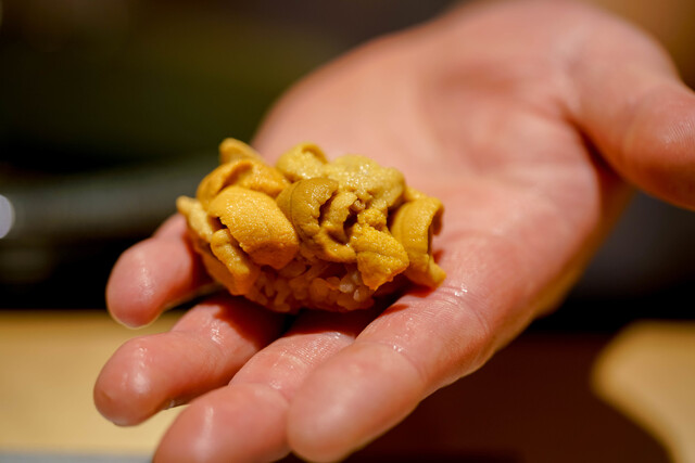 海苔を巻かない手渡しの天草濃い赤ウニ。濃く良い香りがふんわりと。口の中はねっとりした包まれるようなコクある旨味。