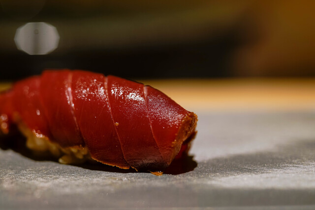 お肉のような艶ある見た目のトロ。脂あるほうが醤油が染み込むようです。