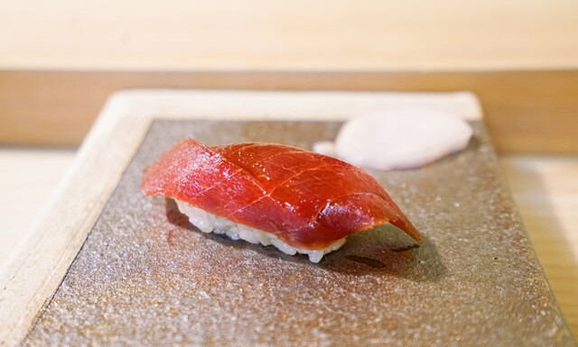 鮨の花形のマグロ。下前の延縄247kg鮪の漬けは2週間ほど寝かせた綺麗なルビー色した旨味マグロ。