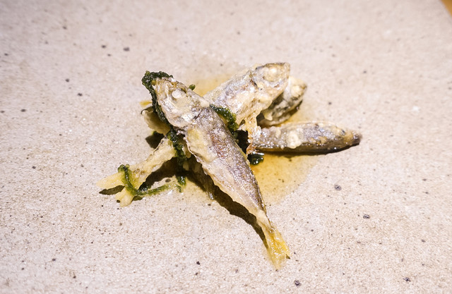 わかさぎに米粉を付けて米油を用いて高い温度でサッと揚げます。