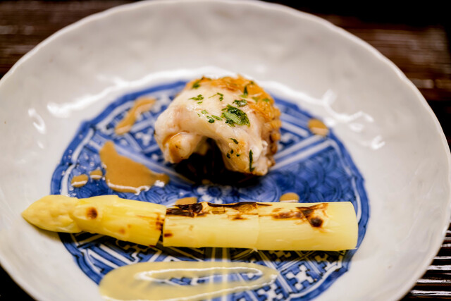 鱧焼き霜。炙った鱧の香ばしさとバチコの艶な塩味が合う。