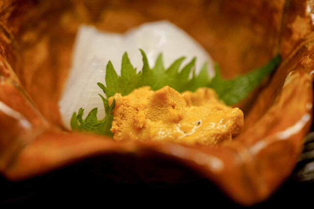 浜中の雲丹と小さな卵を添えて。白甘鯛の旨味とコクが溢れんばかりに味わえる。