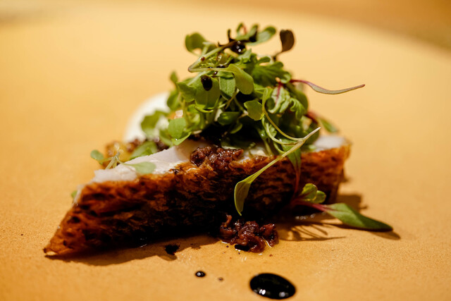 あかむつは、鶏油でコンフィし、味を持った甘みを足します、出汁のような味わい。